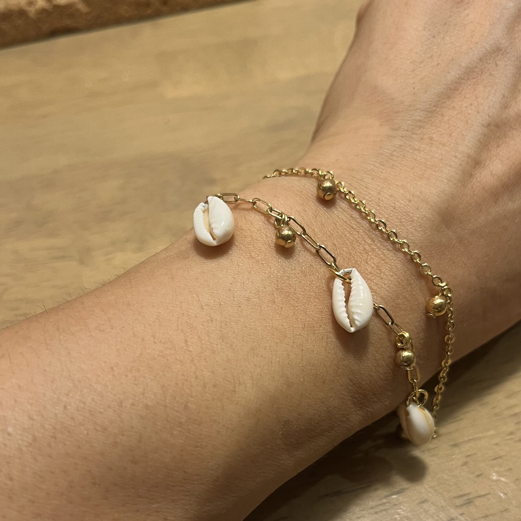 異なるチェーンを組み合わせて2連風に仕上げたデザインは、手元を華やかに演出してくれます。ゆれるカウリシェルとシルバービーズが光を受けてきらりと輝き、リゾートシーンや夏のお出かけにぴったり。